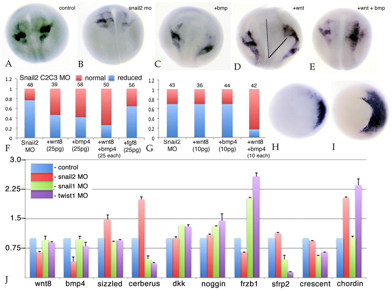 Fig. 6. Further characterization of the snail2 morphant phenotype. (A-E) Xenopus C2/C3 blastomeres were injected with snail2 MO. Compared with uninjected embryos (A), snail2 morphants displayed a reduction in sox9 expression at stage 17/18 (B). This reduction was rescued by the injection of 25 pg/embryo bmp4 RNA (C), wnt8 RNA (D), or the two RNAs together (E). In the case of wnt8 RNA injection, there was often evidence of the formation of a secondary axis (D, line to the right). (F) The percentage of snail2 MO C2/C3 injected embryos rescued (red bar) using 25 pg/embryo fgf8, wnt8, bmp4 or wnt8 and bmp4 (25 pg each) RNAs is shown. (G) In a similar study, lower amounts (10 pg/embryo) of bmp4 and wnt8 RNAs were used. Rescue was observed only when bmp4 and wnt8 RNAs were injected together. (H,I) In situ analysis indicated that the levels and extent of chordin expression increased in stage 11 C2/C3 snail2 morphant embryos (I, versus control in H). (J) At stage 10.5-11, DLMZ from snail2, snail1 or twist1 morphant C2/C3 dorsolateral zones were dissected, RNA was isolated and subjected to qPCR analysis. This revealed reproducible increases in the levels of sizzled, cerberus and chordin RNAs and decreases in the levels of wnt8, bmp4 and frzb1 RNAs; distinct patterns of change were observed in snail1 and twist1 morphant DLMZ. Error bars indicate s.d. |