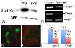 Fig. 1. snail1 MO effects. Xenopus embryos were injected with RNAs encoding myc-tagged GFP (mt-GFP; 50 pg/embryo) and UTR-Snail1-GFP (which latter includes the target of the snail1 MO) RNAs (600 pg/embryo), either alone or together with the snail1 MO (7 ng/embryo). (A) Immunoblot analysis of stage 11 embryos using an anti-GFP antibody revealed a clear and specific reduction in the accumulation of Snail1-GFP as compared with GFP in the snail1 MO-injected sample. (B,C) UTR-Snail1-GFP RNA was injected into one cell of 2-cell embryos either alone (B) or together with the snail1 MO (C). At stage 11, the snail1 MO greatly reduced UTR-Snail1-GFP fluorescence. (D,E) RT-PCR (D) and qPCR (E) analyses indicate that the injection of the snail1 MO into both cells of 2-cell embryos led to a specific reduction in the levels of twist1 and snail2 RNAs at stage 11. Ornithine decarboxylase (ODC) RNA was used to control for non-specific effects. Error bars indicate s.d. |