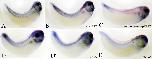 Fig. S2. snail1 morphant effects on neural crest markers. (A-H) Control (A,D,G) and snail1 morphant (one cell of 2-cell embryos injected with 6 ng/embryo) (B,C,E,F,H) embryos were stained in situ at stage 17/18 for twist1 (A-C), chd7 (D-F) and snail2 (G,H). In the injected embryos, lacZ staining is particularly evident on the right-hand side of the embryos shown in C,E,F,H. |