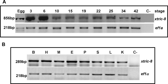 Fig. 2. Temporal analysis of RIC-8 expression pattern in Xenopus development and adult tissue. The expression levels of XtRIC-8 were determined by RT-PCR during different developmental stages of X. tropicalis embryos. Two micrograms of total RNA from each embryonic stage as well as from different adult tissues were reverse-transcribed and amplified using specific primers. Amplification of the ef1α gene, and reactions performed in the absence of reverse transcriptase (C-) were used as housekeeping and negative controls, respectively. (A) The size of each PCR product corresponded to the theoretically predicted sizes of 856 and 218 bp, for xtric-8 and ef1α, respectively. Stages are indicated at the top of each lane. (B) The size of each PCR product corresponded to the theoretically predicted sizes of 289 and 218 bp, for xtric-8 and ef1α, respectively. The tissues are abbreviated as B (brain), H (heart), M (muscle), E (eye), P (pancreas), S (skin), L (lung) and K (kidney).