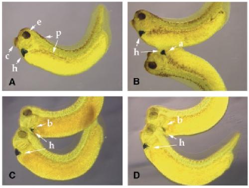 compared to the heart of the twin. e, eye; h, heart; p, endogenous
