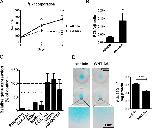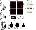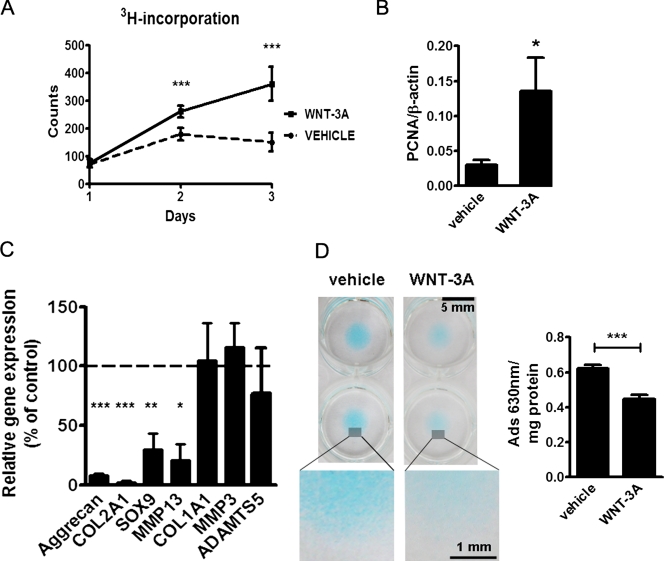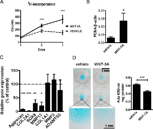Figure 1. WNT-3A induces chondrocyte proliferation and de-differentiation in vitro. (A and B) 100 ng/ml WNT-3A stimulated proliferation of primary chondrocytes in vitro as evaluated by an [H3]thymidine incorporation assay in porcine articular chondrocytes (A; n = 6) and by up-regulation of the proliferation marker PCNA in primary AHACs by quantitative PCR (Q-PCR) (B; n = 4). (C and D) WNT-3A–induced down-regulation of the differentiation markers COL2A1, Aggrecan, SOX9, and MMP13, as evaluated by Q-PCR (C; n = 6), and reduced the accumulation of highly sulphated GAG in primary AHACs (D; by Alcian blue staining and spectrophotometric quantification; n = 4). Gene expression values are reported as a percentage of up- or down-regulation compared with control (100%, broken line in the graph). Statistical analysis was performed with an unpaired t test. Error bars indicate mean ± SEM. *, P < 0.05; **, P < 0.005; ***, P < 0.0005. |
