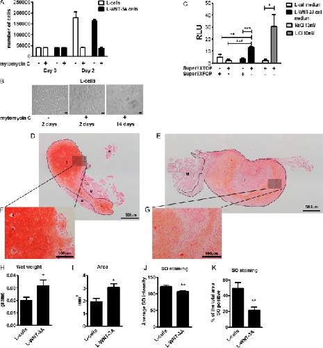 Figure 2. WNT-3A induces proliferation and de-differentiation of articular chondrocytes in vivo. (A and B) WNT-3A induced chondrocyte de-differentiation in vivo in an ectopic cartilage formation assay. Isolated porcine articular chondrocytes were co-injected intramuscularly in nude mice together with either L cells stably expressing WNT-3A (L-WNT3A) or control L cells (L cells; 12 injections per condition). Before injection, L cells and L-WNT-3A cells were growth-arrested by mitomycin C treatment. To confirm growth arrest, 2 d after treatment, a sample of cells with or without mitomycin C treatment was detached and counted (A; n = 4). Mitomycin C–treated cells stopped proliferating. One additional well was kept in culture for 14 d. The cells persisted but never reached confluency (B). Bar, 10 µm. (C) To confirm that mitomycin C growth-arrested L-WNT-3A cells still produced biologically active WNT-3A, the conditioned medium (from the last change of medium) obtained 14 d after mitomycin C treatment was tested for the ability to activate the SUPER8XTOPFlash reporter assay in porcine articular chondrocytes. Indeed, conditioned medium from L-WNT-3A cells, but not from control cells, activated the SUPER8XTOPFlash reporter. The mutagenized SUPER8XFOPFlash vector was used to control for specificity (n = 4). (D–K) SO staining of cartilage implants obtained by the co-injection of porcine articular cartilage with L cells (D) or L-WNT-3A cells (E) in nude mice. Cartilage implants obtained from porcine articular chondrocytes co-injected with L-WNT-3A cells are on average larger (H and I) and less differentiated (J and K), as shown by a decreased SO staining in comparison with controls. Grayscale digital images from SO staining were used to calculate and compare the mean intensity of the staining and, after thresholding, the percentage of the total implant area that was positive for SO (n = 12 per condition). M, muscle; I, implant; RLU, relative luminescence unit. An unpaired t test was used for statistical evaluation. Error bars indicate mean ± SEM. *, P < 0.05; **, P < 0.005; ***, P < 0.0005. |