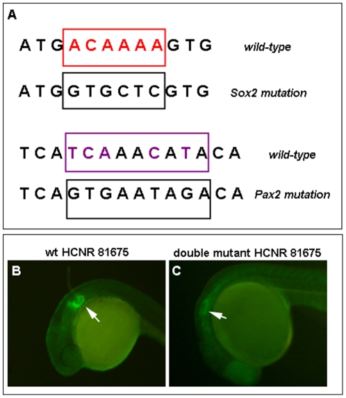 Figure 7. Pax2 and Sox2 proteins are required for HCNR 81675 enhancer activation.(A) Scheme showing wild-type Sox and Pax2/5/8 consensus in the pou3f4 HCNR 81675 sequence and above each one, the mutation in the primers designed for site-directed mutagenesis of the Sox and Pax2/5/8 binding sites. (B–C) Transgenic embryos carrying GFP under the control of the HCNR 81675 enhancer. (B) GFP expression promoted by the wild type HCNR 81675 sequence. (C) GFP expression promoted by the HCNR 81675 enhancer harbouring the double mutation for Pax2/5/8 and Sox binding sites.
