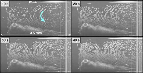 Fig. 5. Recirculating flow patterns. Each panel is a cumulative maximum projection image (i.e. cumulative particle pathline) through the timestamp on each image. Media 2 is the movie from which these still images were taken.
