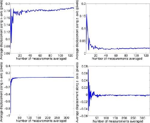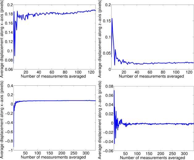 Fig. 9. Plots demonstrating convergence of estimated particle displacement as a function of measurements used in the estimation. The plots on the left side display mean displacement along the x-axis, the right plots mean displacement along the z-axis. The upper two plots are extracted from the pathline in the red rectangle in Fig. 8, the lower two plots are extracted from the pathline in the blue rectangle.