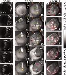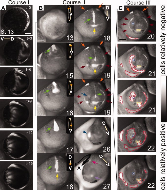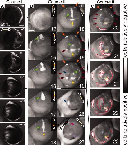 Fig. 2. Regions of relatively hyperpolarized (brighter) and depolarized (darker) Xenopus ectodermal cells are highly dynamic from stage 13 to stage 27. Stages are approximate due to the limitations of judging two dimensional images. Scale bars 250 mm. Orientation of the dorsal-ventral axis is indicated by lines, except in B 13 to 17 where circles indicate that the embryo is rolling towards the viewer; the V indicates the position of the ventral side, while the orange arrowhead indicates the approximate position of the anterior pole. A: Ventrolateral view of course I. A wave of hyperpolarization travels across the embryo in approximately 15 min, then is stationary for several minutes before disappearing. Time (t) is in minutes. B: The first panel shows a ventral view of an embryo at stage 13 in which the circle of hyperpolarized cells of course I is directly visible. Course II of the bioelectric activity begins at approximately stage 14. The visible signal emitted by the interior of the neural tube is particularly intense compared with the rest of the embryo, and changes shape between stages 14 and 19, including an hourglass at 16 to a teardrop at 17 (green arrows). At stage 18, the signal from the neural tube appears to thin. A patch of hyperpolarized cells just anterior to the neural tube signal, at the position of the stomodeum, appears, grows, then remains until approximately stage 23 (yellow arrows, and circles in C). Also at stage 18, hyperpolarized regions appear lateral to the neural folds on the dorsal side; the anterior extents of these regions are visible at the top of these images (orange arrows; see also Fig. 7A). These are visible from stage 18 until stage 21. At stage 19, lateral to the stomodeal region and apposed to the dorsolateral corners of the cement gland, foci of hyperpolarization appear, then spread as thin lines both ventrally, underlining the cement gland, and dorsally reaching the lateral edges of the neural folds by stage 20 (brown arrows), forming a semicircle, approximately in the position of the first pharyngeal pouch. Also at stage 19, a spot of hyperpolarization appears in the right eye/olfactory placode field (blue arrow). At stage 26, the hyperpolarized spot that formed in the eye/olfactory placode area is still present, but by stage 27 that spot is much reduced and in the position of the olfactory placode (light purple arrow). A hyperpolarized spot in the approximate position of the otic placode is also visible at this stage (magenta arrow). C: In course III, foci of hyperpolarity (circled in red) appear, spread, and disappear at different positions on the surface of the embryo, coincident with embryo stretching (compare stage 20 to stage 22). Also shown is that a course III area can spread over a course II area (blue and yellow circled areas) without disturbing it. |
