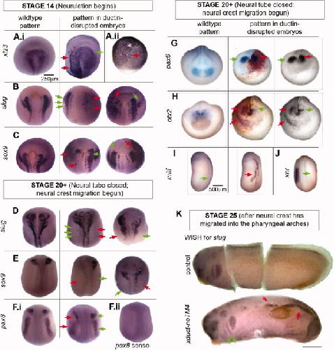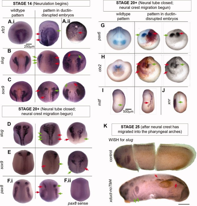 Fig. 4. Wholemount in situ hybridization (WISH) indicates that ductin-dependent Hflux is upstream of RNAs in the CNC and placode signaling pathways. Embryos injected with xduct-noTM4 were probed for developmentally regulated mRNAs. In all images, red arrows point to abnormal and green to normal staining patterns. A: Dorsal/anterior views of WISH in stage-14 embryos showing the wildtype pattern (left), an injected embryo with lower than normal expression (center), and an injected embryo with higher than normal expression (right). A.i: xfz3, a marker of neural crest; no embryos were found that had loss of xfz3 staining on one side but were otherwise normal. A.ii: In many xduct-noTM4-injected specimens, cells staining positively for xfz3 appear larger than normal at early stages (stage 10 shown). B: slug, a marker of CNC cells. C: sox9, at this stage a marker for otic capsule formation. D: Embryos at stage 20. D: slug, a marker of CNC cells. E: sox9, a marker for otic capsule formation and CNC. F.i: otic placodeF.ii: Control using the pax8 sense strand lacks non-specific staining; all other sense strand controls were also negative (not shown). G: Expression of pax6, an eye-field marker. Middle column: b-gal, used to label the injected side of the embryo, shows that the disruption to pax6 expression is on the injected side. Right column: A red filter was placed on the camera to give a clear image of the WISH signal. H: Expression of otx2, a marker for olfactory placode and lens. Middle and right columns as in G. Like pax6, otx2 is posterior to its normal domain on the injected side. Ectopic staining is also apparent. I: At stage 22, expression of mitf, a marker for the neural crest melanocyte lineage, is visible in a region appearing to be ectopic neural fold. J: At stage 22, normal sized, one-sided expression domain of xnr-1 in a ductin-disrupted embryo shows that ductin inhibition does not affect other patterning genes. K: Stage-25 embryos stained for slug. The top embryo is an untreated control (cut to lie flat for imaging) showing the normal staining of slug in the pharyngeal arches. The lower embryo was injected with xduct-noTM4 into one blastomere at the 2-cell stage. The pharyngeal arches have been populated normally, but there is ectopic staining of slug; both of these observations are consistent with neural crest cell motility being unaffected by ductin disruption. |