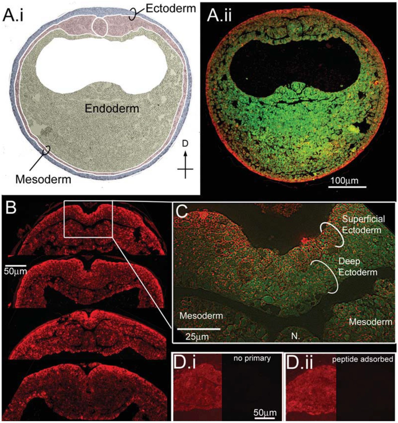 Fig. 6. Ductin is present at high levels in the superficial ectoderm during neural plate stages. A: Immunohistochemistry for ductin on cross-sections from neurulating embryos. A.i: Germ layers are indicated on the DIC image of the section in A.ii. A.ii: Green is autofluorescence of the section, red is ductin signal. Ductin is ubiquitous, but stains most strongly in the superficial ectoderm (SE) at this stage. B: Cross-sections through the dorsal midline showing various configurations of the neural fold. In all sections, ductin signal is strongest in the SE. C: Higher magnification shows ductin concentrated in, although not exclusively localized to, the SE. D.i: Control section exposed to 2 Ab only. The left side of the image has been manipulated in Photoshop to show the position of the section; right side of image shows the actual signal at same exposure as B. D.ii: Control sections exposed to peptide-adsorbed antibody; sides as in D.i. |