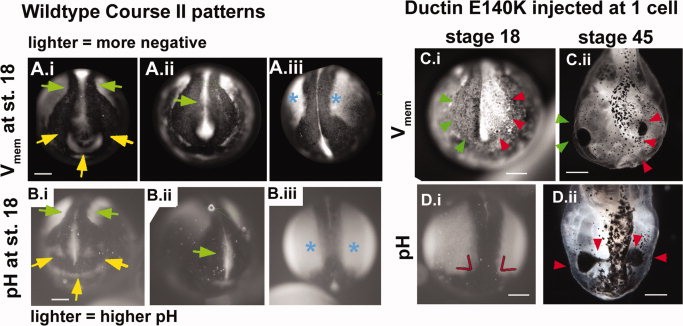 Fig. 7. Inhibition of ductin causes changes in voltage patterns that correlate with CF phenotypes. A: Stills of wildtype embryos showing the pattern of Vmem in the anterior and antero-dorsal regions of neurulae at approximately stage 18. Arrowheads point to the most consistent features of the pattern (11 of 11 uninjected embryos). A.i: Green arrows point to depolarized neural folds. Yellow arrows point to hyperpolarization in the future olfactory/oral region. A.ii: Green arrow points to the disappearing signal from the neural tube floor. A.iii: Blue asterisks mark hyperpolarized ectodermal regions lateral to the neural folds. B: The pattern of pH in the anterior and antero-dorsal regions of untreated neurulae. Arrows point to features of a normal pattern, and are the same as Vmem shown in A. C, D: Abnormal regionalization of Vmem and pH caused by injection of xductnoTM4. C.i: Abnormal Vmem patterns were seen in 9 of 13 injected embryos. Green arrowheads point to the normal depolarized neural folds, red arrows to the abnormal hyperpolarized side. D.i: Red lines indicate the abnormal angle between the high pH lateral ectoderm and the low pH anterior folds. C.ii, D.ii: The same embryos imaged at stage 45 display gross malformations (red arrowheads) in the areas with abnormal Vmem or pH. |