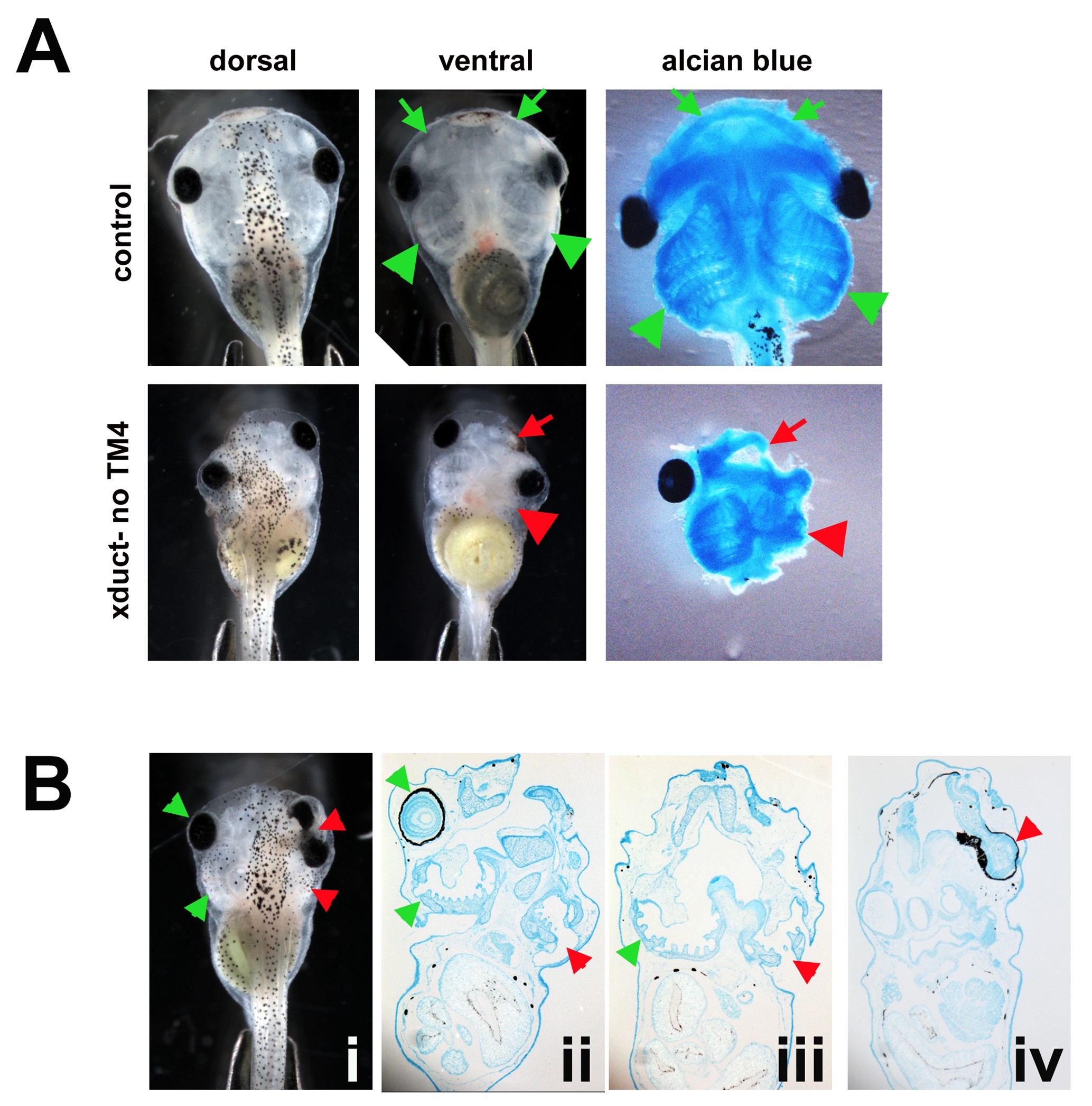 Supporting Figure 1 Alcian blue staining indicates that ductin inhibition affects facial cartilage morphology at stage 45. A: Embryos injected with xduct-noTM4 and uninjected embryos were fixed, stained with alcian blue, and the soft tissues were dissected away from the cartilage. Arrowheads indicate branchial arches, arrows indicate jaws; in all images, red indicates abnormal and green indicates normal morphologies. Alcian blue staining clearly indicates that both the jaw and branchial arch cartilage were affected by ductin inhibition. B: An embryo injected with xduct-noTM4 was imaged at stage 45 (B.i), fixed, stained with alcian blue, embedded in paraffin, and sectioned. B.ii: Ventral sections show a normal-sized and shaped eye on the left side, and a small branchial arch on the right side. B.iii: More dorsal sections also show a small branchial arch on the right side. B.iv: The right eye is actually two fused eyes, which are joined to the olfactory epithelium. This is also apparent in the image of the whole animal (B.i) |