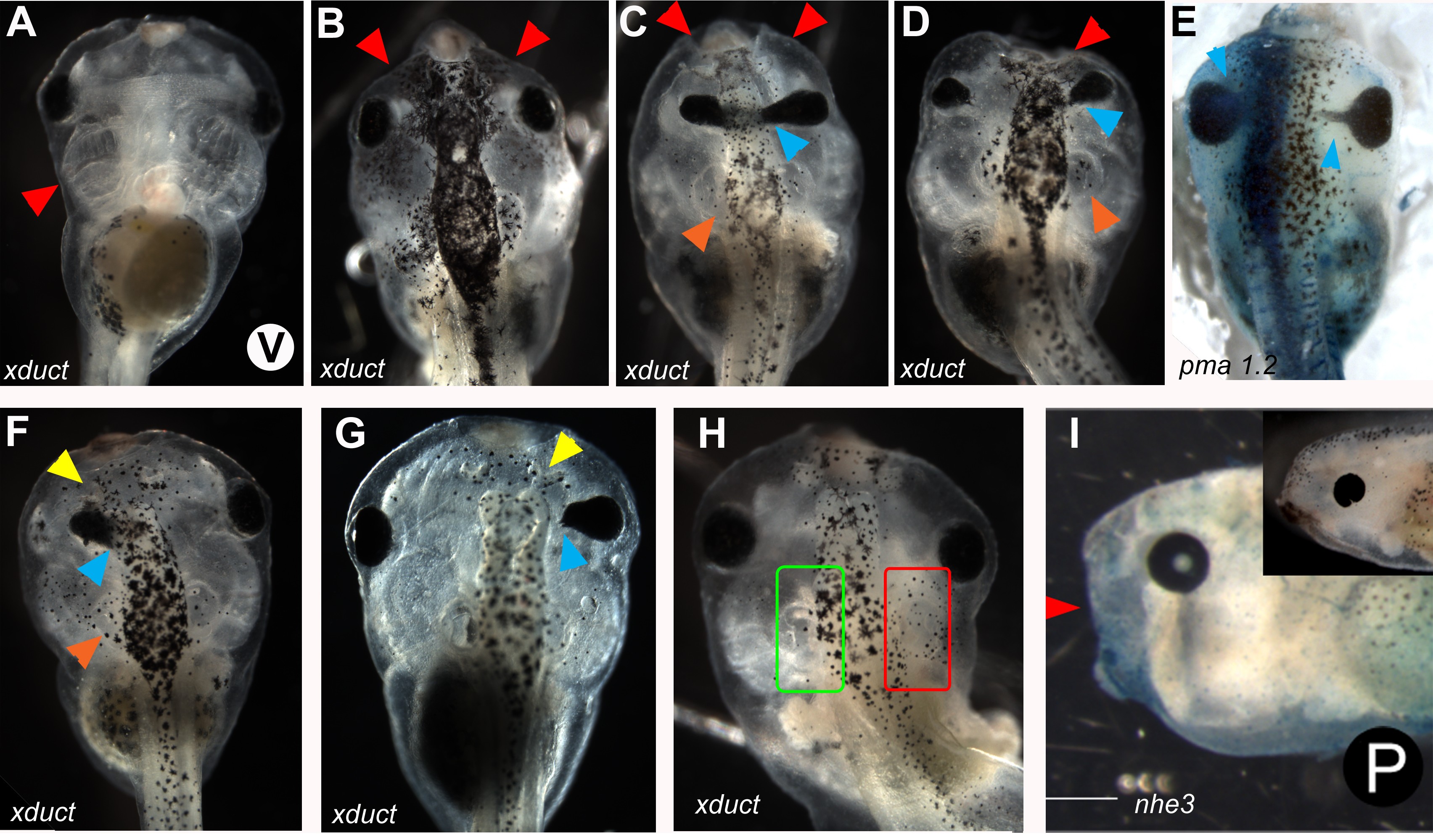 Supporting Figure 3 Craniofacial phenotypes induced by wildtype xduct and ductin-independent gain-of-function reagents. Ductin loss-of-function produced a range of craniofacial phenotypes (see Fig. 2). Reagents predicted to act as gain-of-function agents, including the sodium-hydrogen exchanger nhe3, and a yeast proton pump pma1.2, were also tested for their affects on morphology. We also examined the effect of wildtype ductin mRNA (xduct). Tadpoles were scored and imaged between stage 45 and 48. All three of these constructs produced a similar suite of phenotypes to each other and to xduct-noTM4 and concanamycin. In all images, the construct injected is indicated and arrowheads point to abnormal structures. All views are dorsal except where indicated by a V (ventral) or a P (profile). Anterior is up except in I, where anterior is left and dorsal is up. A: Tadpole illustrating unilateral small branchial arches (BA; red arrowhead). B: Tadpole with bilateral reduction in BA and jaw (red arrowheads). C: Tadpole with bilateral reduction in BA and jaw (red arrowheads), and eyes with thickened pigmented optic nerves (blue arrowhead) that are joined across the midline. The left otolith is missing (orange arrowhead). D: Tadpole with abnormal right BA and jaw (red arrowhead), an eye with thickened pigmented optic nerve (blue arrowhead), and a missing right otolith (orange arrowhead). E: Tadpole with pigmented optic nerves (blue arrowheads). F: Tadpole with missing left olfactory pit (yellow arrowhead), left eye fused to the brain (blue arrowhead), and malformed left otocyst (orange arrowhead). G: Tadpole with its right olfactory pit fused to the brain (yellow arrowhead), and a malformed right eye (blue arrowhead). H: Tadpole with a missing right otolith (red circle); normal left otolith circled in green. I: Profile of tadpole lacking jaws (red arrowhead). Inset: normal profile. |