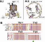 Fig. 1. Ductin basics. A.i: Ductin (purple) is part of the transmembrane proton transporting V0 domain of the HV-ATPase (Entrez Gene Name: ATPase, Htransporting, lysosomal 16 kD, V0 subunit c; drawing after Hinton et al., 2009). The V0 domain includes a hexamer comprising four ductin monomers plus two similar proteins, c0 and c00. Protons () enter subunit a on the cytoplasmic side (top thin black arrow) and are picked up by a glutamic acid (E140, green) in TM4 of ductin. After rotation (curved, open arrow), ductin delivers the proton to another site in subunit a, which releases it to the other side of the membrane (lower thin black arrow). A.ii: The HV-ATPase acidifies the lumen of intracellular vesicles, including lysosomes. In some cells, it is present in the plasma membrane. B: The amino acid sequence of ductin is very highly conserved. The four transmembrane domains are indicated by the purple background; the proton binding E is indicated by the green arrowhead. The top sequence is Xenopus ductin, the next is xduct-noTM4. Below that are the cow, chick, mouse, rat, human, and zebrafish sequences. |
