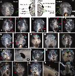 Fig. 3. Range of tadpole craniofacial phenotypes caused by injection of xduct-noTM4 at the 1-, 2-, or 4-cell stage. Tadpoles were scored and imaged between stage 45 and 48. In all images, large red arrowheads indicate abnormalities of jaws and branchial arches, large blue arrowheads indicate eye or pigment abnormalities, small yellow arrowheads indicate olfactory pit abnormalities, small orange arrowheads indicate otocyst and/ or otolith abnormalities, and small white arrowheads indicate abnormal brain tissue. All views are dorsal except where indicated by a V (ventral) or a P (profile). Anterior is up except in K and R in which anterior is left and dorsal is up. All scale bars 1 mm unless otherwise indicated. A: Wildtype morphology, dorsal and ventral aspects; drawing summarizes major structures. Scale bar 500 mm. B: Ventral and dorsal views of a tadpole with badly malformed jaw and left branchial arches (red) as well as a malformed otolith (B.ii, orange). C: Ventral view of a tadpole with small left-sided branchial arches (red). D: Ventral and dorsal views of a tadpole with left-sided abnormalities of the jaw, branchial arches (red), eye (blue), and olfactory pit (yellow). E: Ventral view of malformed left-sided branchial arches (red). F: Ventral view of bilateral abnormalities of the jaws and branchial arches, which lack the normal teeth (red). The left eye of this tadpole is not visible and thus abnormal (blue). G: Bilateral abnormalities of the jaw (red), eyes (blue), and otoliths (orange); the branchial arches are also small. H: Pigmentation of the optic nerve (blue), a commonly seen abnormality. I: Thickening and pigmentation of the connection between the eye and brain (blue) is also commonly observed. This tadpole also has a malformed or missing olfactory pit (yellow) and abnormal growth of the brain (white). J: Unilateral changes to the olfactory pit (yellow), eye (blue), and branchial arches (red). In this tadpole, the eye appears to be directly attached to the brain. K: Eye with two lenses; it is not clear which lens is ectopic (blue). Scale bar 250 mm. L: Embryo with a small eye (blue) and missing otocyst/otolith (orange). M: Tadpole with ectopic pigment near to the eye (blue), extra brain tissue (white), and missing otocyst/otolith (orange). N: Tadpole with malformed eyes and ectopic pigment along the midline (blue), as well as brain shape abnormalities (white). O: Tadpole with an ectopic eye, connected to the original by a pigmented bridge (blue) that is fused with the olfactory pit (yellow). P: Tadpole with left-sided abnormalities including small branchial arches (red), and a second brain (white) apparently fused to a large distorted eye (blue) and olfactory pit (yellow). Q: Tadpole with small outgrowth of brain (white), a misformed otocyst (orange), and a missing otolith on the left side. R: Ectopic otoliths growing along the dorsal midline. Scale bar 500 mm. S: This froglet received xduct-noTM4 at the one-cell stage, developed into a tadpole with a malformed eye, then metamorphosed. The eye abnormality is still visible (blue). |