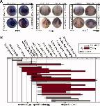 Fig. 5. Inhibition of ductin by concanamycin affects WISH patterns and indicates that ductin is required during late gastrulation and early neural plate stages. A: Treatment of embryos with the highly specific ductin inhibitor concanamycin leads to changes in the WISH patterns of xfz3, slug, and sox9. Like injection of xduct-noTM4, these changes can be seen as early as stage 14 and are still apparent at stage 20. Embryos in the top row of each panel were exposed to concanamycin from stage 13 to stage 14, then fixed at stage 145 for WISH; embryos in the bottom row were exposed from stage 14 to stage 16, then fixed at stage 180 for WISH. Timing was chosen on the basis of the concanamycin exposure experiments shown in B. B: Effect of exposure to the ductin-inhibitor concanamycin at different stages (indicated on the top and bottom); each horizontal bar represents a batch of embryos treated with concanamycin; gray bars indicate that this sample did not have significantly more CFPs than the untreated control, red bars indicate a significant difference of >10% between controls and experimentals (a 0.01). Error bars represent an estimate of the uncertainty of identifying stages. Exposure to concanamycin from stage 13 to 16 caused craniofacial abnormalities. |