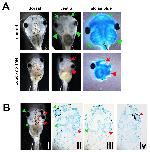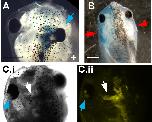 Supporting Figure 2 Lineage tracers distinguish characteristics of ductin inhibition on placodal versus neural crest derived organs. Embryos were co-injected with a β-gal lineage tracer plus xduct-noTM4, or they were injected with xduct-YFP. In both cases, one blastomere of 2-cell embryos was injected. A: Embryo co-injected with xduct-noTM4 and β-gal has an eye attached directly to the brain. The affected eye (blue arrow) is on the same side as the injection, as was observed in almost all cases. B: An embryo co-injected with xduct-noTM4 and β-gal with small, underdeveloped jaws and BA on both sides (red arrows). The β-gal signal indicates that only one side of this embryo actually received injected mRNA. C: To account for possible differences in the localization of β-gal lineage tracer and ductin mutant mRNA, we further verified these results using a fluorescently labeled xduct construct (xduct-YFP). C.i.: Brightfield image. Cii: Fluorescent signal from YFP. Again, eye phenotypes (blue arrow) were observed only on the injected side. This embryo also has abnormal growth of brain (white arrows), which is clearly labeled with YFP. |