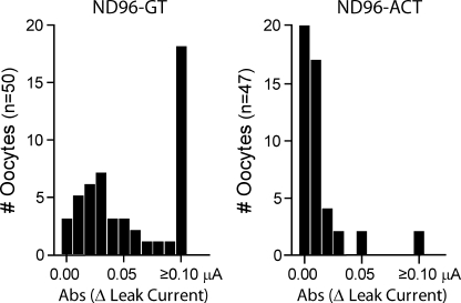 Figure 2. Infected oocytes exhibit reduced viability, which can be prevented with amikacin/ciprofloxacin supplementation. Histographs of the absolute change in leak current of oocytes incubated for 4 d in gentamicin/tetracycline (ND96-GT)- or amikacin/ciprofloxacin (ND96-ACT)-supplemented media. Change in leak current at –80 mV was calculated by subtracting the initial current value upon clamping from the value at 2 min. Data are from 2–5 batches of oocytes.