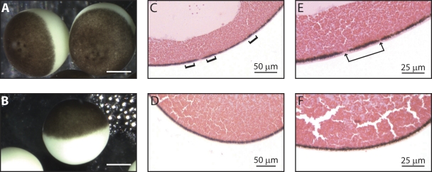 Figure 3. Amikacin/ciprofloxacin supplementation prevents black foci formation. Bright-field micrographs of extracted oocytes incubated for 4 d in tetracycline/gentamicin-supplemented (ND96-GT; A) or amikacin/ciprofloxacin-supplemented media (ND96-ACT; B). Bars, 0.5 mm. Histopathology slices of a compromised oocyte (C) and a healthy oocyte (D), magnified in E and F, respectively. Brackets denote areas of increased pigmentation; arrows indicate areas devoid of pigment molecules, both of which were only observed in infected oocytes.