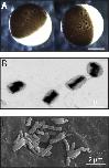Figure 1. Xenopus laevis oocytes infected with multi-drug–resistant bacteria. (A) Bright field micrograph of extracted oocytes showing the characteristic black foci and unpigmented halo. Bar, 0.5 mm. (B) Transmission electron micrograph of P. fluorescens cultured from compromised oocytes. (C) Scanning electron micrograph of bacteria on the surface of compromised oocytes.