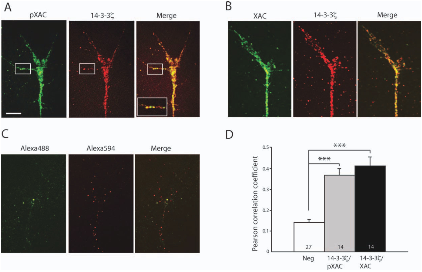 Figure 6 Colocalization of 14-3-3ς with pXAC and XAC. (A) Growth cone staining with Alexa 488-conjugated pXAC antibody and Alexa 594-conjugated 14-3-3ς antibody. The squared area shows colocalization in a filopodium. The inset shows more magnified view of the squared area (scale bar = 5 μm; image intensity adjusted). (B) Growth cone staining with Alexa 488-conjugated XAC antibody and Alexa 594-conjugated 14-3-3ς antibody. (C) Growth cone staining with Alexa 488 and Alexa 594 fluorophores without antibody conjugation. (D) Measurement of Pearson coefficient for determination of colocalization (n = no. of growth cones;***p<0.001; statistical analysis by Kruskal–Wallis test with Dunn post-test). (R1)