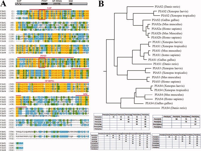 Figure 1. PIAS proteins are conserved across the vertebrate species. A: Alignment of the four Xenopus laevis PIAS proteins reveals that they share a high degree of homology within the known functional domains, including the SAP, PINIT, SP-RING, and SIM domains (marked by the red lines above the sequences), but are more divergent in the carboxyl termini. The LXXLL motif in the SAP domain and the PINIT motif in the PINIT domain are marked by the closed boxes. B: Alignment of vertebrate PIAS proteins shows that PIAS are highly conserved in vertebrate. The phylogenic tree constructed using the neighbor-joining algorithm is shown here, and the identity tables for each vertebrate PIAS protein are shown at the bottom.Download figure to PowerPoint