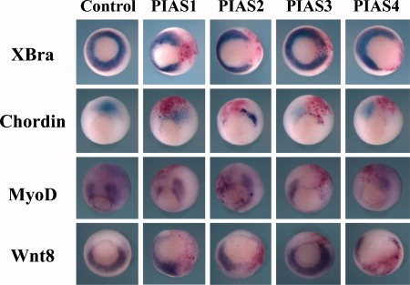 Figure 4. Overexpression of PIAS disrupts early mesodermal formation. In situ hybridization was performed to assess mesodermal formation in embryos injected with PIAS RNAs. While all four PIAS genes inhibited expression of Chordin, XBra, and MyoD, they displayed different efficiency in doing so, with PIAS3 having weak XBra inhibitory activities. Unlike PIAS1, 2, and 4, PIAS3 did not block expression of Wnt8 efficiently. The doses of the RNAs used in this experiment were: 1 ng PIAS1, 0.5 ng PIAS2, 2 ng PIAS3, and 1 ng PIAS4.Download figure to PowerPoint