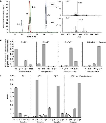 Figure 2. Peptide-based MS analysis of Erk. (A) Equal amounts of each of the synthetic internal standards were subjected to LC/MS. The left panel shows three superimposed extracted ion chromatograms for the m/z values expected for 0 (red), 1 (blue) and 2 (green) phosphorylations. Each individual chromatogram has been normalised to the intensity of its maximal peak. The singly phosphorylated peptides were identified by MS2. The right panels show the normalised MS2 spectra for the z=3 charge state (m/z=745.33) eluting around 24.2 min (top) and around 20.9 min (bottom). The top spectrum shows the neutral loss of phosphoric acid (m/z=712.7) that characterises pTY. Its absence in the bottom spectrum characterises TpY. (B) Phospho-form distributions of each of the four Erk samples. The peak area of the phospho-form was divided by the peak area of the corresponding internal standard, and the four ratios for each phospho-form were then sum normalised as proportions of the total. Data were pooled from experiments carried out on different days, with five replicates for Erk-TY and Erk-pTpY and three replicates for Erk-pTY and Erk-TpY; the error bars give the mean±s.d. of the corresponding normalised values. (C) The values in B have been rearranged for comparison with Figure 1D. Each vertical sub-panel shows the results for the phospho-form listed at the top of the sub-panel, for each of the four samples, as listed horizontally. The arrows show the corresponding comparisons with those in Figure 1D. Source data is available for this figure at www.nature.com/msb.Source data for Figure 2B.