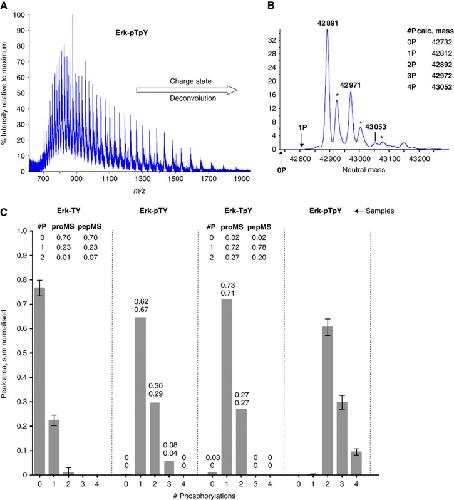 Figure 4. Protein-based MS analysis of Erk. (A) Mass/charge spectrum of intact Erk-pTpY, showing multiple charge states. (B) Neutral mass spectrum of Erk-pTpY, after charge-state deconvolution. The calculated masses of 15N-labelled His6-tagged Erk2, with 0 to 4 phosphorylations are listed in the inset. Those for 2P, 3P and 4P agree to within 100 p.p.m. with the peaks marked in the spectrum. The positions that would have been occupied by the 0P and 1P states are shown by vertical arrows. Three of the remaining peaks correspond to oxidation products (+32Da, marked by asterisks). (C) Sum-normalised distributions of isobaric groups for each of the four samples, showing 0–4 phosphorylations. Only two phosphorylation sites were detected in the Erk-TY and Erk-TpY samples and the insets compare the proMS values with those calculated from the pepMS data in Figure 2B. Five replicates were used for Erk-TY and Erk-pTpY and the error bars show mean±s.d. Due to insufficient material, only two replicates were possible for Erk-pTY and Erk-TpY. The corresponding columns show the mean, with the two data points listed above to show the variation. Source data is available for this figure at www.nature.com/msb.Source data for Figure 4C.