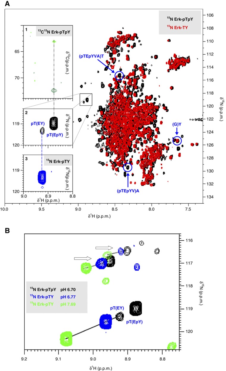 15N in p.p.m. (B) Superimposition of three 1H/15N HSQC spectra, colour coded as described in the legend. Note that the horizontal and vertical ranges are different from the insets in part a. The minor peak in the Erk-pTpY spectrum falls on the same pH titration line as the major peaks in the Erk-pTY spectra, supporting the assignment in A. The resonances in the two pH titration lines at the top (arrows) show that there are at least two more pS or pT residues in addition to that on the canonical TEY motif, as discussed in the text. These additional peaks could not be assigned by NMR as their 3D HNCACB intensities were too low.