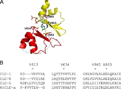 Figure 1. Homology modeling of the C-terminal domain of CLC-1. (A) Homology model of the CBS domain of CLC-1 shown in ribbon presentation. The two segments of CLC-1 sequence corresponding to CLC-5 are colored in red and yellow, whereas the segment that is missing in CLC-5 is illustrated with a dotted black line. ATP is shown in stick presentation (in CPK color). Key amino acids examined in this study are colored in yellow (V613), orange (V634), blue (V860), and purple (E865). (B) Sequence alignment of CLC-0, CLC-1, CLC-5, and AtCLC-a for the region encompassing the four residues shown in A.