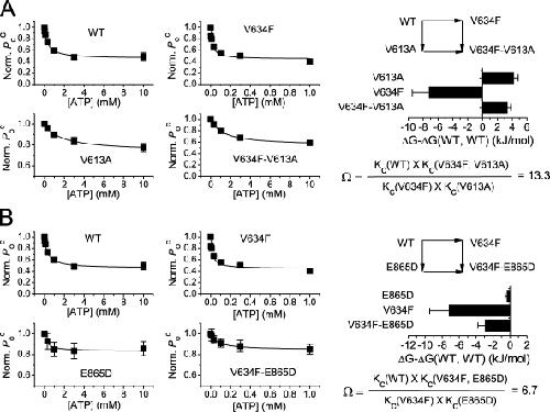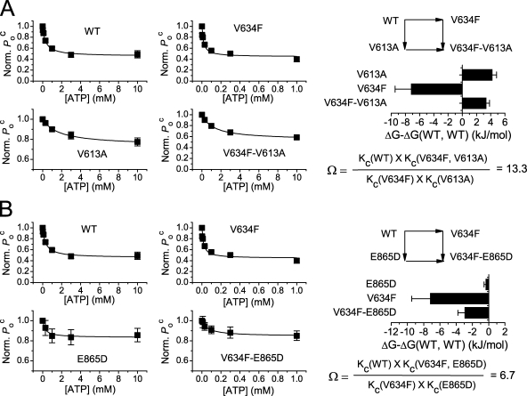 Figure 7. Nonadditive effects of mutations on the ATP modulations of CLC-1. The parameter Poc(ATP)/Poc(control) was used as the response to ATP modulation. (A) Mutant cycle analysis of the effects of V634F and V613A mutations on the ATP modulation. ATP dose–response curves of single point mutants and the double mutants were constructed to determine the values of Ko and Kc. The fitted Kc values were used to calculate the free energy differences of single or double mutants (bar graph) according to Eq. 3 and the coupling constant, Ω, according to Eq. 4. In the context of Eq. 2, the V634F mutation corresponds to the change from X1 to X2, whereas the V613A mutation represents the change from Y1 to Y2. (B) Double mutant cycle analysis for V634F/E865D mutations. The values of Ω at different voltages are shown in Fig. S2. Error bars represent SEM. n = 4–8.