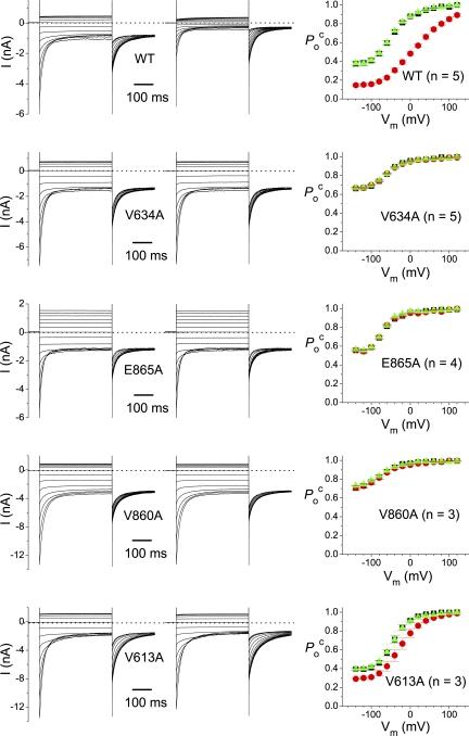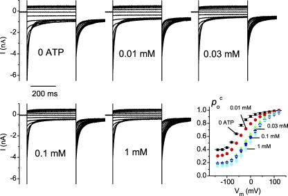 Figure 4. The V634F mutation increases the apparent affinity for the ATP modulation. Representative recording traces were obtained from an excised patch of the oocyte expressing the V634F mutant in control (0 ATP) and in various concentrations of ATP as indicated. The averaged Poc-V curves of the V634F mutant in various ATP concentrations are shown in the bottom right panel. Error bars represent SEM. n = 7.
