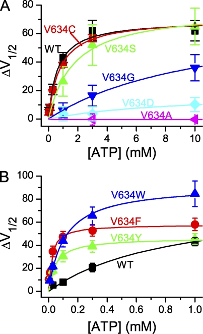 Figure 5. Shift of the V1/2 of the Poc-V curve (ΔV1/2) in various mutants of V634 as a function of the ATP concentration. Data points were fitted to Eq. 1 to determine the apparent K1/2 and V1/2,max. (A) Mutants of V634 in which the apparent ATP affinity is reduced. For comparison, the ATP dose–response curve of WT CLC-1 is also shown. (B) ATP dose-dependent curves of WT CLC-1, V634F, V634Y, and V634W. Error bars represent SEM. n = 4–8.