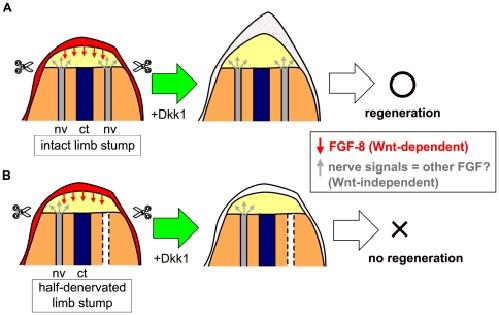 Figure 8. Model for Wnt/β-catenin and nerve signals in early limb regeneration in Xenopus froglets.(A) Successful blastema formation in the intact forelimb of the hsDkk1 froglet. Wnt/β-catenin signaling (presumably mediated by wnt-3a in the epidermis) induces fgf-8 expression in the epidermis. Induction of Dkk1GFP expression by heatshock diminishes epidermal fgf-8 expression. However, nerve signals released from the nerves around the limb stump have some redundant function with FGF-8 and/or the product(s) of another Wnt downstream gene(s), whereas Dkk1GFP does not markedly affect the function of the nerve signals. The nerve signals can substitute for the role of the Wnt downstream gene, so that the limb stump can continue the blastema formation process and form a spike, even after blockage of Wnt/β-catenin signaling. (B) Interrupted blastema formation in the half-denervated forelimb of an hsDkk1 froglet. When the limb stump is partially denervated, the amount of nerve signals is thought to be around half of that in an intact limb stump. This level of nerve signals is insufficient to substitute for the role of the Wnt downstream gene. Thus, most of the limb stumps cannot continue the blastema formation process, resulting in no regeneration, after blockage of Wnt/β-catenin signaling. Considering the redundant function of the nerve signals and a Wnt downstream gene, the nerve signals may be mediated by another member of the FGFs. Scissors indicate the amputation plane. nv, nerves; ct, cartilage.