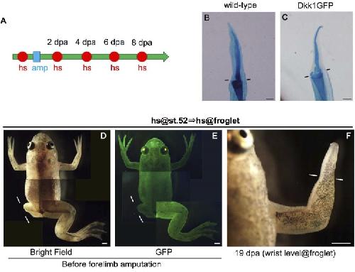 Figure 3. hsDkk1 does not block spike regeneration in the froglet. (A) Experimental scheme for froglets. One heatshock (hs: represented as a red circle) was applied to the froglets 3 to 4 h before amputation. The forelimb was amputated through the distalzeugopodium (amp: represented as a blue square) followed by a heatshock every other day until 8 dpa. (B and C) The hsDkk1 froglets (C) regenerated a spike like the wild-type froglets (B). (D-F) hsDkk1 had a different effect on regenerative capacity of the tadpole and froglet within the same individual. hsDkk1 expression induced at the tadpole stage (st. 52) blocked regeneration of the lefthindlimb bud amputated at the presumptive knee level (D). After this hsDkk1 tadpole had become a froglet, hsDkk1GFP expression could still be induced effectively by heatshock (E). However, repeated heatshocks as shown in (A) could not block forelimb regeneration of the same hsDkk1 froglet (F). Lines indicate the estimated amputation plane (knee level for the hindlimb bud, distalzeugopod level for the forelimb). Scale bar = 500 mm for (B) and (C) and 1 mm for (D), (E), and (F).