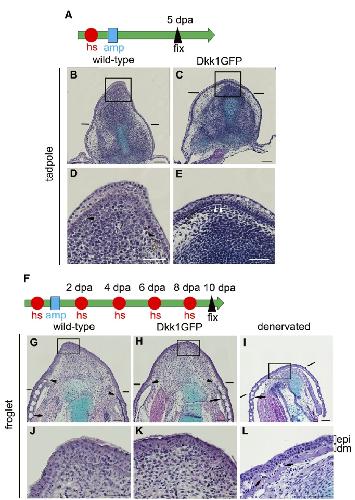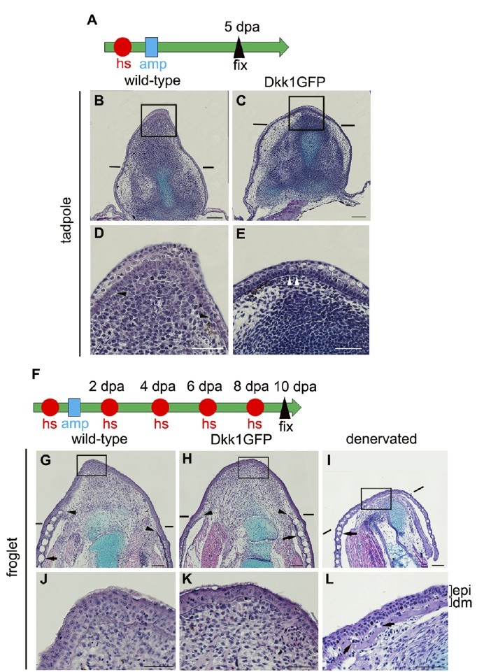 Figure 4. Histological examination of limb blastemas/stumps with or without blockage of Wnt/b-catenin signaling. (A) Experimental scheme for tadpoles. One heatshock (hs: represented as a red circle) was applied to stage 52 tadpoles 3 to 4 h before amputation. The hindlimb buds were amputated at the presumptive knee level (amp: represented as a blue square), and fixation was done at 5 dpa. (B) Longitudinal sections of the limbblastema/stump of wild-type (B, D) and Dkk1GFP (C, E) tadpoles. Panels D and E are high-power views of the boxed regions in B and C, respectively. The distinct basement membrane is indicated by arrowheads. No distinct basement membrane was seen at the tip of the blastema, indicated by arrowheads in (D), while the basement membrane covered the entire amputation plane of the limb stump in (E). (F) Experimental scheme for froglets. One heatshock was applied 3 to 4 h before amputation. The forelimbs of the froglets were amputated through the distalzeugopodium followed by a heatshock every other day, and fixation was done at 10 dpa. (G) Longitudinal sections of the limbblastema/stump of wild-type (G, J) and Dkk1GFP (H, K) froglets. Panels J and K are high-power views of the boxed regions in G and H, respectively. Cone-shaped blastemas were formed in both wild-type (G) and Dkk1GFP (H) froglets. These blastemas were covered with dermis-free epidermis, and no skin gland was seen in the blastemal region of wild type (J) or Dkk1GFP froglets (K). In the denervated forelimb, no cone-shaped blastema was formed (I) and a differentiated dermis with skin glands covered the amputation plane at 10 dpa (L). ep, epidermis; dm, dermis. Arrows indicate skin glands. Arrowheads indicate the edge of a distinct basement membrane. Lines indicate the estimated amputation planes. Scale bar = 100 mm for (B), (C), (G), (H), and (I) and 50 mm for (D), (E), (J), (K), and (L). doi:10.1371/journal.pone.0021721.g004