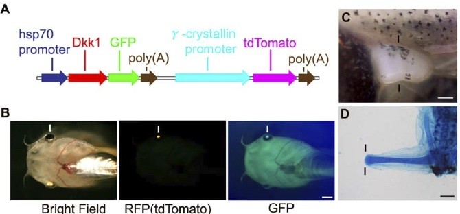 Figure 2. Refined procedure for heat-shock-inducible inhibition of Wnt/b-catenin signaling in Xenopus laevis. (A) Map of the heat- shock-inducible Dkk1GFP transgene with lens labeling. Details are described in Experimental Procedures. The bright RFP variant, tdTomato under control of the 2.2-kb crystallin promoter, was introduced downstream of hsp70-Dkk1GFP. (B) Prior to heatshock, a tadpole containing the transgene could be recognized by the tdTomato fluorescence in its lenses. After heatshock, ubiquitous Dkk1GFP expression was induced in the lens-labeled tadpoles. Note that the tdTomato protein in the lens was detected through a GFP filter as well as through an RFP filter. (C) Dorsal view of the lefthindlimb bud at stage 52. (D) Induction of hsDkk1 expression at stage 52 completely blocked regeneration of the hindlimb bud. Nothing was regenerated from the amputation level. Lines indicate the estimated amputation planes (knee level for the hindlimb bud). Arrows indicate the lens region of tadpoles. Scale bar = 1 mm for (B) and (D) and 250 m for (C). See also Figure S1.
