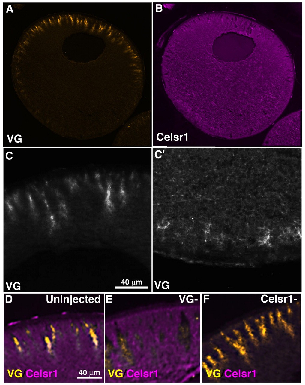 Fig. 1. Vangl2 and Celsr1 distribution in wild-type, full grown (stage 6) Xenopus oocytes. (A,B) Histological sections of stage 6 oocytes showing immunostaining pattern for Vangl2 (VG) protein (A) and Celsr1 protein (B). (C,Câ²), Higher magnification of animal (C) and vegetal (C') hemisphere distribution of Vangl2 protein. (D-F), Images of animal hemisphere sections co-immunostained for Vangl2 and Celsr1 in uninjected control sibling (D), Vangl2-depleted (VGâ; E) and Celsr1-depleted (Celsr1â; F) stage 6 oocytes.