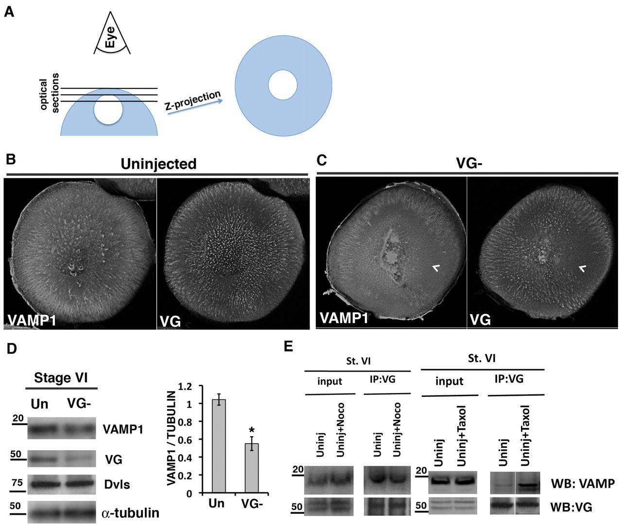 Fig. 4. Vangl2 is required for VAMP1 protein levels. (A) Diagram showing the procedure for generating the z-stack images shown in B and C. (B,C) z-stacks of the entire animal hemisphere projected as a single image for control (B, Uninjected) and Vangl2-depleted (C, VGâ) stage 6 Xenopus oocytes, co-immunostained for VAMP1 and Vangl2 (VG) proteins. Chevrons point to areas that are devoid of both VAMP1 and Vangl2. (D) Western blot of lysates from stage 6 control (Un) and Vangl2-depleted (VGâ) oocytes probed for VAMP1 and Vangl2. Antibodies against alpha-tubulin and Xenopus Disheveleds (Dvls) are used as loading controls. Quantification is shown for VAMP1 versus alpha tubulin for this experiment. The experiment was repeated with a similar result (*P<0.02, determined by t-test). Error bars represent s.d. (E) Co-immunoprecipitation analyses showing that endogenous Vangl2 protein interacts with VAMP1 in control (Uninj) and nocodazole (Noco)-treated stage 6 (St. VI) oocyte lysates, and that the interaction is increased by taxol treatment.