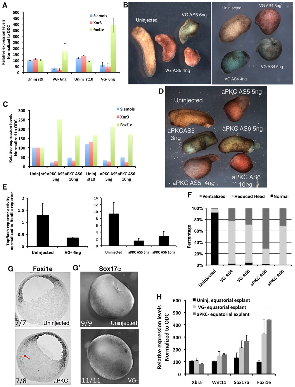 Fig. 7. Maternal Vangl2 and aPKC depletion disrupts the pattern of expression of specific zygotic genes. (A) Relative expression levels of Siamois, Xnr3 and Foxi1e mRNAs in control (Uninj) and Vangl2-depleted (VGâ) embryos at the late blastula (st9) and early gastrula stages (st10) determined by real-time RT-PCR (mean±s.d.). (B) Phenotype of embryos derived from sibling control (Uninjected) and Vangl2-depleted oocytes (VG AS5, 4 and 6 ng oligonucleotide injected; VG AS4, 4, 6 and 8 ng oligonucleotide injected) at the early tailbud stage. (C) Relative expression levels of Siamois, Xnr3 and Foxi1e in control (Uninj) and aPKC-depleted embryos (AS5, 5 ng; AS6, 10 ng) determined by real-time RT-PCR at the late blastula and early gastrula stages. The experiment was repeated with a similar result. (D) Phenotype of embryos derived from sibling control (Uninjected) and aPKC-depleted oocytes (AS5, 3, 4 and 5 ng; AS6, 5 and 10 ng) at the early tailbud stage. (E) TOPflash reporter activation after injection into two dorsal vegetal cells of 8-cell stage control embryos compared with sibling Vangl2-depleted (left-hand graph) and aPKC-depleted (right-hand graph) embryos frozen at the late blastula stage, showing the reduction in canonical Wnt signaling activity (mean±s.d.). (F) Percentage of embryos with different phenotypes derived from Vangl2-depleted (AS4 and AS5), aPKC-depleted (AS5 and AS6) and sibling control at the tailbud stage. (G) Histological section of whole-mount stained, in situ hybridization of sibling control (upper) and aPKC-depleted (lower) early gastrulae using a Foxi1e probe. Arrow indicates ectopic expression of Foxi1e in the vegetal mass. (Gâ²) Whole-mount in situ hybridization of sibling control (upper) and Vangl2-depleted (lower) early gastrulae using a Sox17a probe. (H) Relative expression levels of Xbra, Wnt11, Sox17a and Foxi1e in equatorial zones of control (Uninj.), Vangl2-depleted (VGâ) and aPKC-depleted (aPKCâ) embryos dissected at the late blastula stage and assayed by real-time RT-PCR (mean±s.d.).