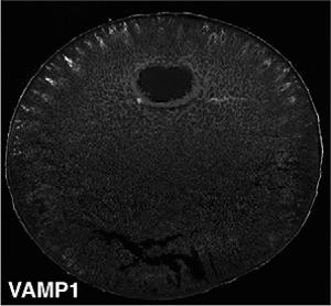vamp1 (vesicle associated membrane protein 1) gene expression in sectioned Xenopus laevis embryo via immunohistochemistry at stage 6, animal cap is up.