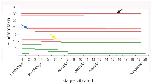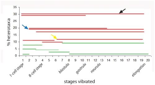 Figure 2. Vibration period influences the frequency of laterality defects.When embryos were vibrated at 7 Hz during different periods of development, striking differences in the rate of heterotaxia were observed. Most effective were vibrations that started at 1 cell and went through mid-gastrula (st. 10.5) or neurula stages (st. 19, see black arrow). Somewhat less effective were vibrations starting just a short time later, at the 2 cell stage (blue arrow). Finally, vibrations that included a second period of time, around st. 6, were able to disrupt left-right patterning, but to a lesser degree (see yellow arrow, for example). For all groups, a red line indicates significant differences from non-vibrated controls (χ2 test, p<0.01) and heterotaxia rates above the minimal meaningful difference of 10%. A green line indicates that the treatment either was not significantly different from controls or was below the minimal meaningful difference of 10% heterotaxia. All lines are the summed data from two or more replicate studies. |