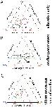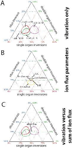 Figure 5. Ternary plots reveal unique signatures of inverted organs depending on the timing of vibration treatment. All heterotaxic embryos were compiled by treatment and graphed on a ternary plot where one axis represents the % of embryos with single organ inversions, the second axis represents the % of embryos with two (double) organ inversions, and the third axis represent the % of embryos with situs inversus (all three organs inverted.) Data is graphed so a single point represents each treatment, surrounded by an oval that illustrates the 95% confidence interval (CI); when the ovals do not overlap, the groups are significantly different from each other [67]. A) Unique signatures of embryos vibrated from 1 cell to st. 19 (blue), 2 cell to st. 19 (red), 4 cell to st. 19 (green) or st. 6 to st. 19 (violet) demonstrate that the period of vibration significantly affects the organ inversions observed. Most striking are the differences in the incidence of situs inversus, which is highest in embryos vibrated from 1 cell to st. 19 and lowest in embryos vibrated from st. 6 to st. 19. B) Signatures of affected organs are very similar in heterotaxic embryos from groups treated with chemicals and molecular constructs targeting H+ pumps (yellow), K+ channels (blue), gap junctional communication (GJC, green), the cytoskeleton (red), and the LR signaling molecule serotonin (5HT, purple). For a complete list of the reagents used, see Supplemental Table 2. C) The ion flux data shown in panel B was combined and statistically collapsed to produce a datapoint that represents all ion flux-related treatments (black dots, inside the violet circle). This was compared to the signatures obtained from the vibration protocols (panel A). The ion flux data thus overlaps with the signatures obtained from vibrations occurring from st. 6 through neurulation (violet). |