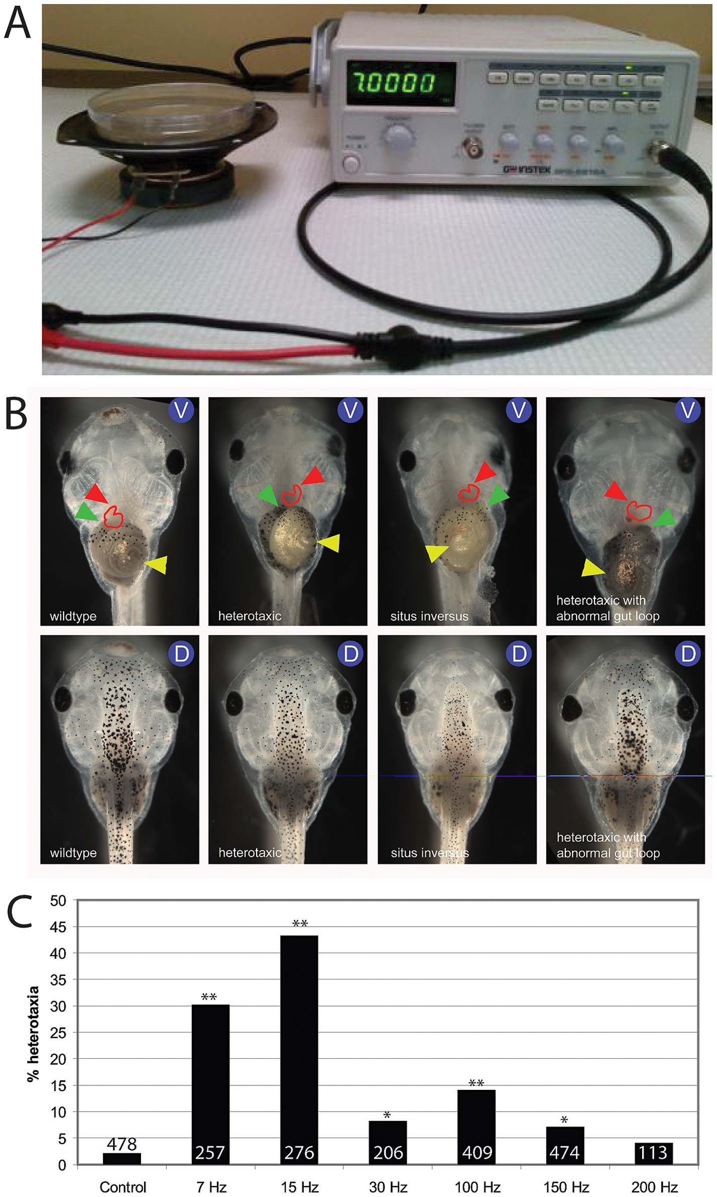 Figure 1. Heterotaxia is induced by various low frequency vibrations. A) A simple experimental device was produced from a Gwinstek GFG-8216A function generator (right) attached to a 4-inch Sony speaker (left). A petri dish, with the appropriate solution containing embryos, was placed on top of the speaker at various stages. B) Ventral views (V) showing organ position and dorsal views (D) showing normal dorsoanterior development in tadpoles with wildtype situs, heterotaxia, and situs inversus. In all panels of ventral views, the red arrowhead indicates the apex of the heart, yellow indicates the stomach, and green indicates the gall bladder. For wildtype organ situs, the apex of the heart loop is located on the animal's right side, the stomach coils to the animal's left, and the gall bladder is positioned on the animal's right. The heterotaxic tadpole shown here has an inverted heart, but normal position of the stomach and gall bladder. There are seven combinations of position of the three scored organs that are each examples of heterotaxia, including situs inversus, where all three organs are inverted. The right-most panel also shows an animal with heterotaxia, with an inverted stomach and gut, but normal position of the heart. Note that the coiling of the stomach is also abnormal, a phenotype observed in a minority of vibrated embryos (<5% at 7 Hz). C) Quantification of heterotaxia in embryos vibrated at different frequencies from 1 cell through st. 19 of development. 7 Hz and 15 Hz were the most effective at randomizing the LR axis, but 15 Hz vibration also produced other developmental abnormalities in a large subset of embryos (not shown); therefore, 7 Hz was selected for additional study. Numbers on bar graphs indicate sample sizes from a combination of two or more replicate studies. * p<0.01, but not biologically relevant because heterotaxia rates were below 10%, the minimal meaningful difference. ** p<0.001, Ï2 test. |