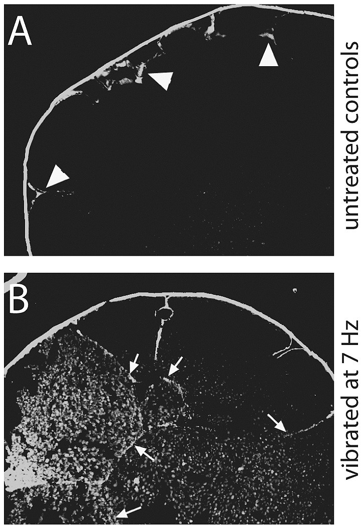 Figure 7. Epithelial integrity is disrupted in vibrated embryos. A) Using a biotin permeability assay, we determined that epithelial integrity was maintained in control embryos such that the biotin signal was normally observed at the outer edges of the embryo, less than 1 cell depth (arrowheads). B) In vibrated embryos, the biotin signal was observed much farther into the embryo, with signal several cell layers deep (arrows). |