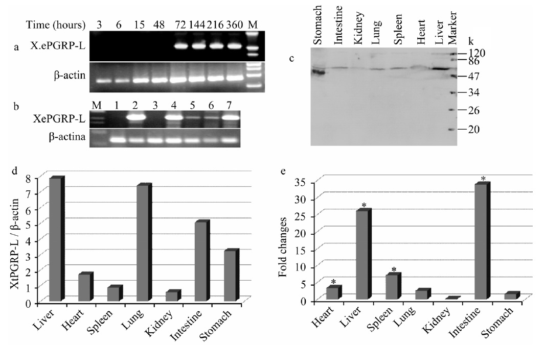 XtPGRP-L in normal Xenopus tissues. (d) Quantitative PCR analysis of the XtPGRP-L expression in normal Xenopus tissues. (e) Quantitative PCR analysis of