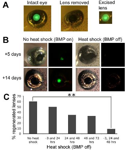 Figure 1. BMP signalling is required for lens regeneration. A) Lentectomy of N1 transgenic tadpoles at stage 50. These tadpoles carry the Hsp70:Noggin; γ-Crystallin:GFP transgene and express GFP in the central lens cells, but not the outermost lens epithelial cells. Removal of the lens can be visualised by the lack of GFP in the lentectomised eye. B) Heat shock initiates expression of the BMP inhibitor noggin, attenuating BMP signalling. In around 60-70% of non heat shocked, lentectomised eyes, regeneration of the lens from the overlying cornea occurs and GFP can be seen after 3-5 days and a new lens is formed after 14 days. When the tadpoles are subjected to heat shock, no GFP is expressed and no lens regenerated. Bright field views are to the left with corresponding fluorescent views adjacent. C) Graph showing the effect of heat shock activation of Noggin on lens regeneration as determined by the presence of any detectable GFP in the eye 10 days after lentectomy. ** indicates p < 0.001. (Chi squared analysis). |