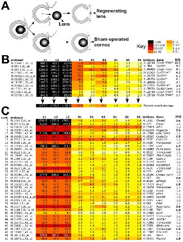 Figure 3. Identification of genes that mimic expression of crystallins during CLT. A) Strategy for identifying CLT specific genes by microarray. Lenses were removed from stage 50 tadpoles and used for RNA extraction of samples L1-3 (differentiated lens). The tadpoles that had undergone lentectomy were allowed to recover for three days before harvesting the cornea for samples R1-3 (regenerating). Finally, a second set of tadpoles were subjected to mock surgery, the cornea was cut, lifted and replaced as for lentectomy but the inner cornea and lens were left in situ. After 3 days corneas were recovered from these animals, generating samples S1, 3 and 4 (sham operated). B) Heatmap of Affymetrix array data showing that the pattern of crystallin expression varies among replicate R samples, with R2 consistently lower. An average expression was used to search for similar patterns in the data. C) Heatmap of top 50 significant matches to the crystallin pattern, excluding the crystallin genes used to generate the pattern average. R/S is the ratio of transcript expression in R1-3 vs. S1, 3 and 4 levels. Bold type in C indicates R > 1.5 S. |