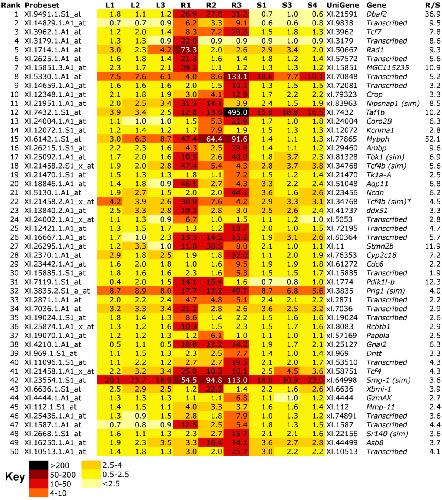 Figure 5. Heat map of top 50 genes, where expression is higher in samples undergoing CLT (R) than in stage matched sham operated corneas (S) or lenses (L). Darker colour indicates higher expression. R/S indicates the ratio of transcript expression in R1-3 vs. S1, 3 and 4 levels. Where possible, the genes have been manually annotated with reference to the probe source files. Transcribed is used to denote genes where no annotation was possible. (sim) indicates high similarity to the named gene.