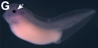 Figure 6. Expression of selected transdifferentiation genes during development. In situ hybridisation of five regeneration associated genes (RAG). Dark blue staining marks expression, and a white arrow indicates the position of the lens. A) Nipsnap1 expression appears in lens cells at stage 30 (A) and is also found in the pronephros (pn) and branchial arches (ba) from stage 32 (B). At stage 36, Nipsnap1 expression is seen in the pronephros and pronephritic duct (pnd) and otic vesicle (ov) as well as in the periphery of the lens (C). D) Tbp1b is expressed predominantly in lens, otic vesicle and branchial arches at stage 32. E) Tcf7 is expressed in lens and choroid fissure of the retina (cf), the midbrain-hindbrain junction (m/h), cement gland (cg), otic vesicle and pronephritic duct at at stage 32. F) Pdik1l is expressed in the developing lens and retina (re) and branchial arches at stage 32. G) Dvl2 is expressed in eye tissues but is not specific, with expression extending throughout the embryo including the somites (s), otic vesicle and branchial arches. Embryos are oriented with anterior to the left and dorsal uppermost. |